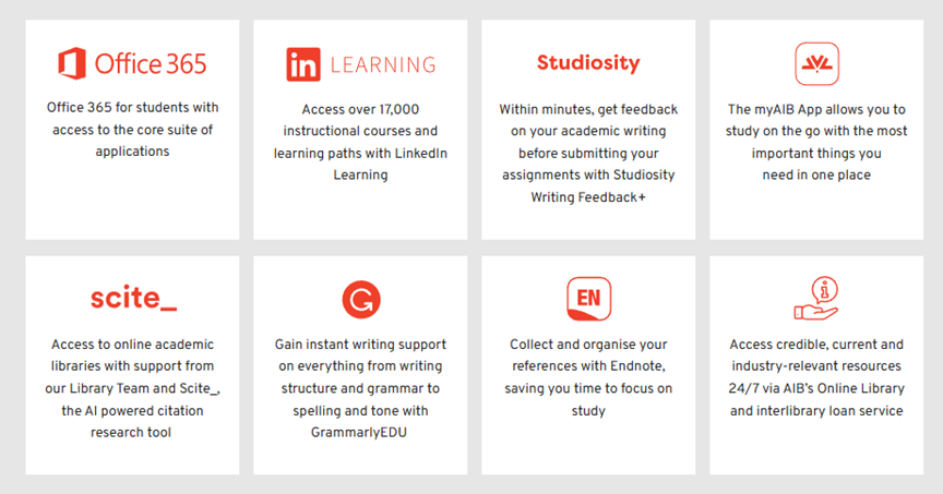 As an AIB student, you’ll also have exclusive access to a range of resources designed to strengthen your academic skills and support your success. During Orientation, our team will guide you through the resources available and provide support to get set up and ready to go.