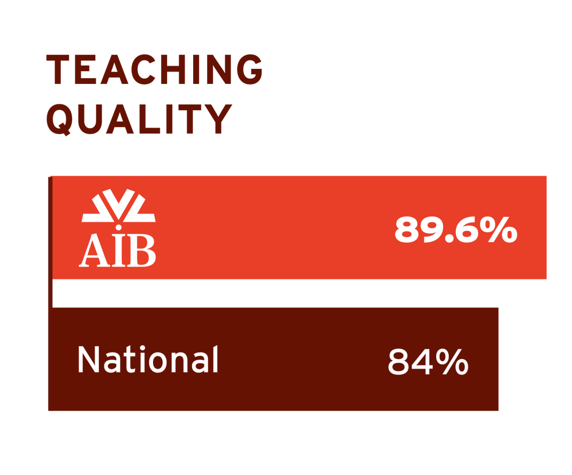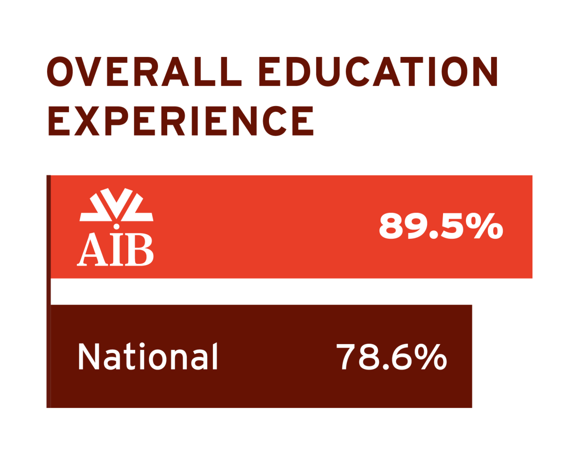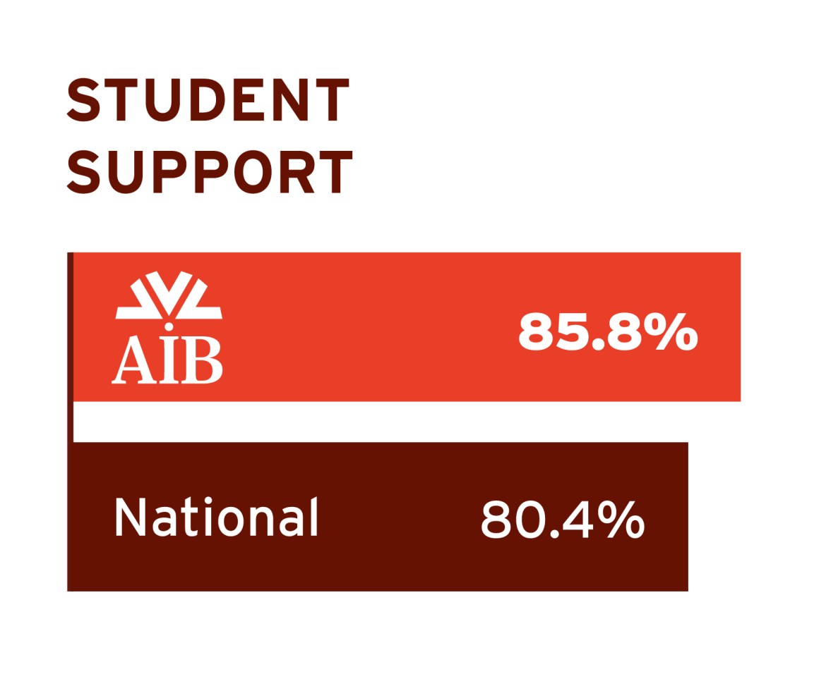 Based on results from the 2023-2024 SES Survey comparing 83 postgraduate Business and Management institutions nationally, AIB outperformed the industry average across numerous student experience metrics.